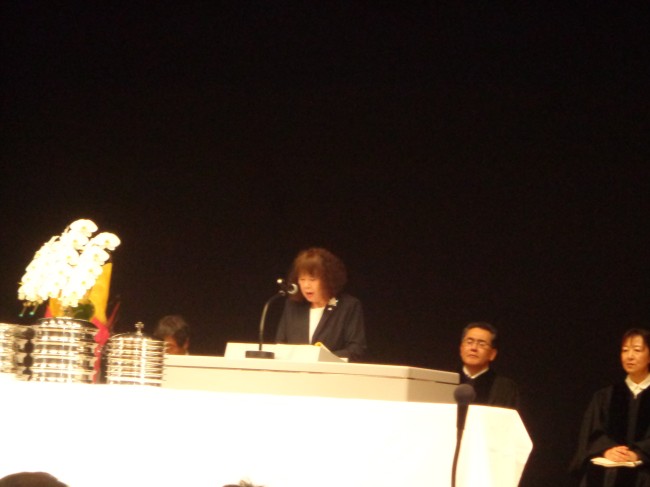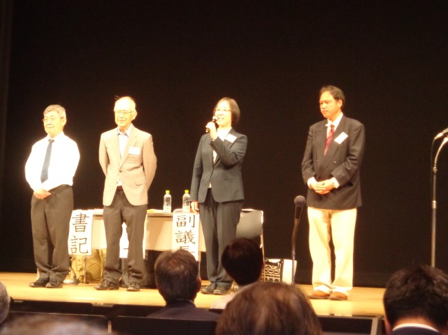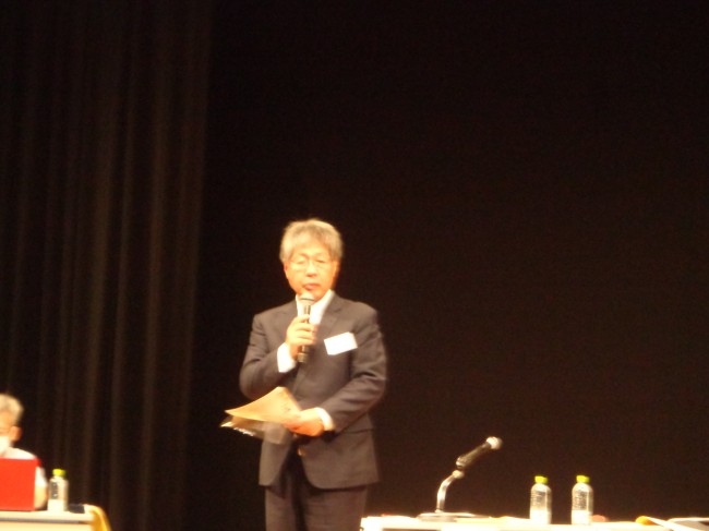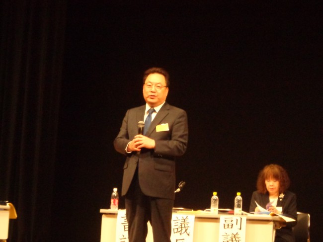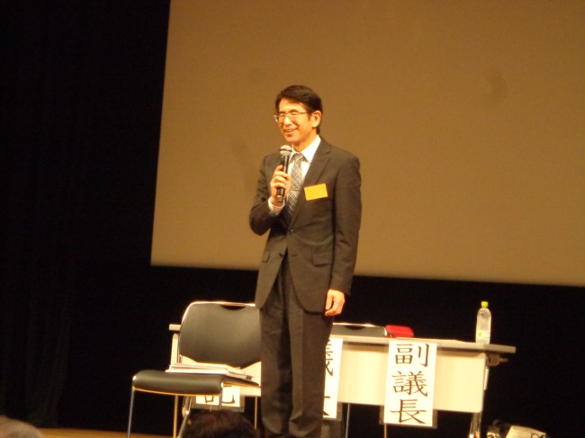 | 同じく挨拶をする教団年金局の中川義幸理事長 |