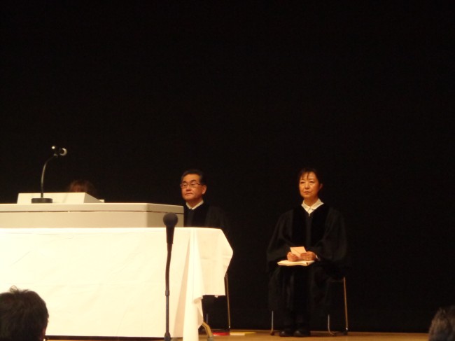 | 聖餐式の司式を務めた原田彰久牧師(東京聖書学校吉川教会・左)と補助の渡邊典子牧師(三芳教会・右) |